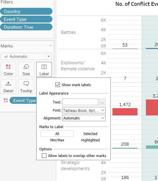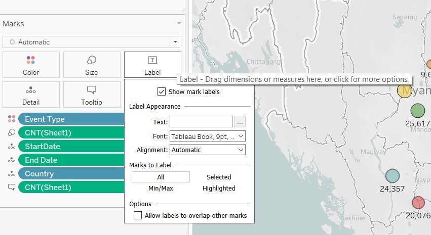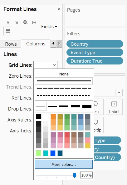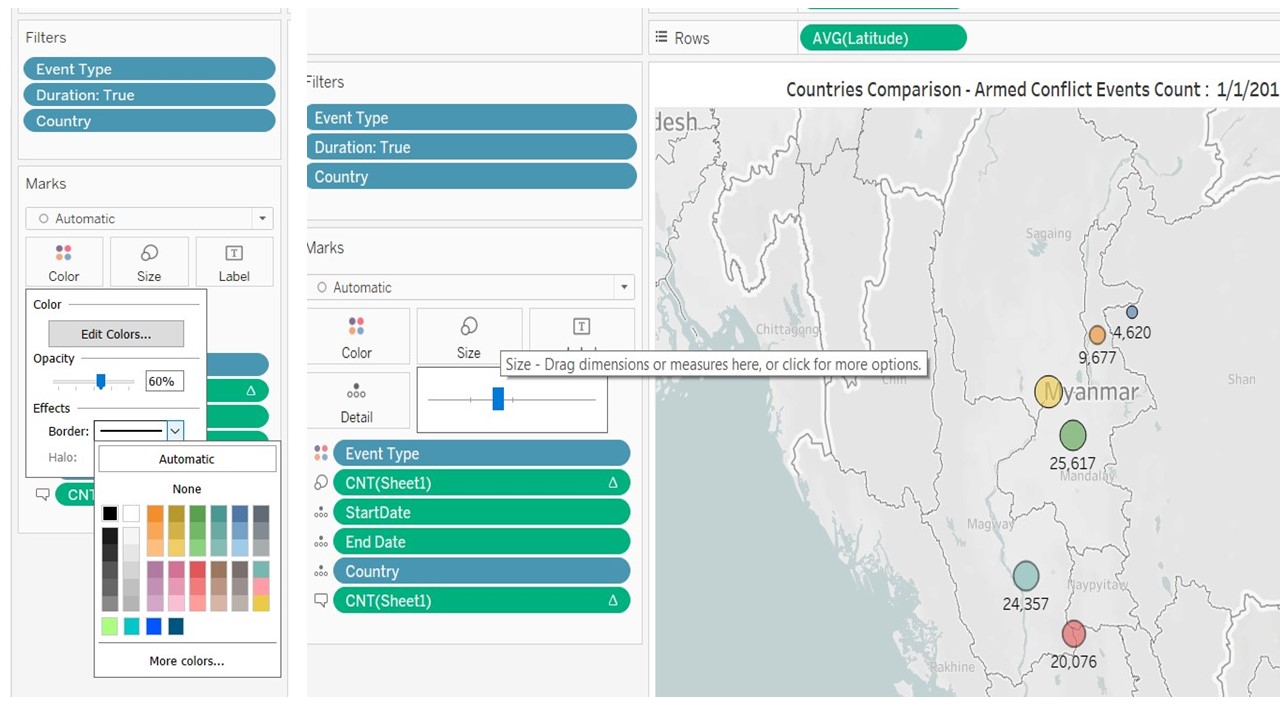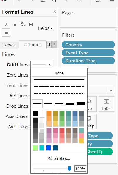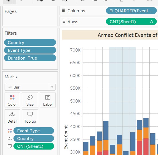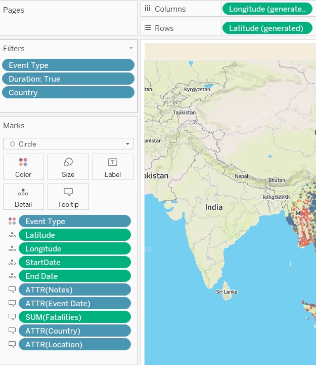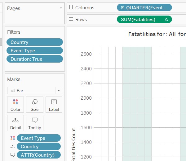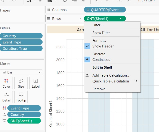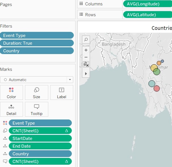 7.2.2 Configure the filters to show filter: Country ,Event Type, Duration ( from the Filters Panel). Configure the colours to show filter : Event Type ( from the Marks panel ). For Duration, configure as slider. For Event Type/Country- configure as dropdown checkpoint list, multiple.Rename the title of the filters – so that they are linked back meaningfully to the chart. Unhide the ‘Legend’ in the filter.