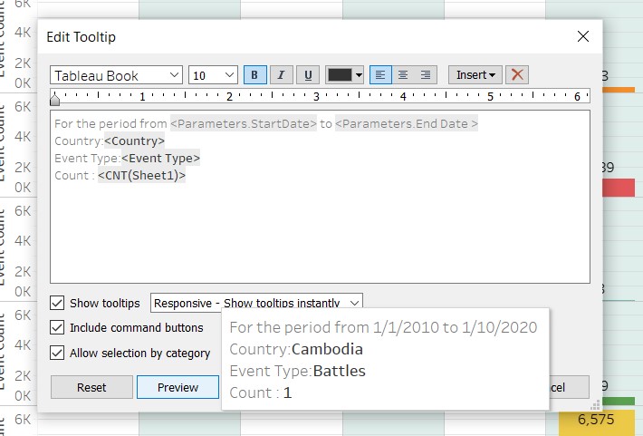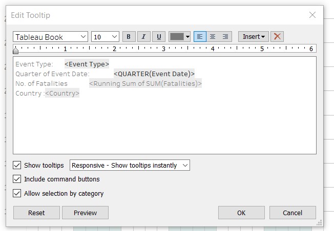 The implementation : allow for Event Date,Notes,Fatalities,Country,Location to be part of informative tool tip.