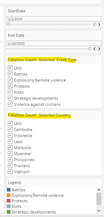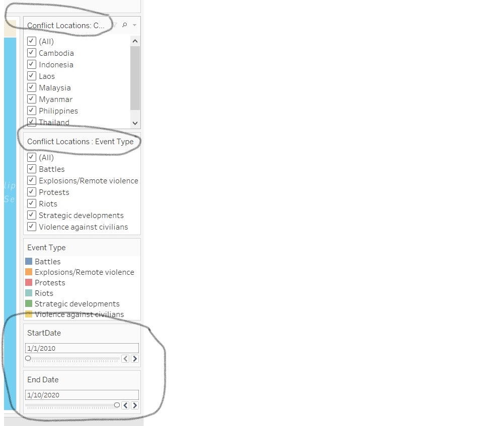 7.5.7 Configure the filter panel to turn on the filters for Event Type, Country, and the Legend, as well as the StartDate and EndDate – calculated field. Rename the filter appropriately.