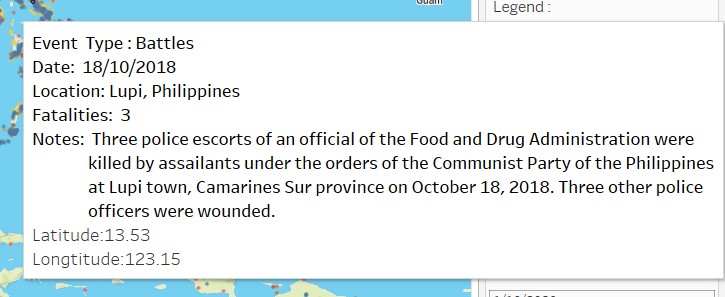 Based on chart ‘Location of conflict events’. It can be observed Philippines has a variety of events across the all islands, and also in eastern Thailand. Whereas in other parts of South East Asis eg. events are more spreadout, or occurring only in certain parts of the country eg. In Indonesia only in Central Java.