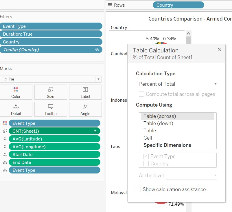 7.3.6 Implement a pie-chart worksheet for the tooltip. This piechart allows the user to see for each country what is the percentage of event type, compared to the total events.