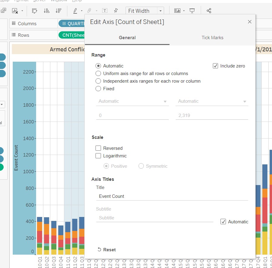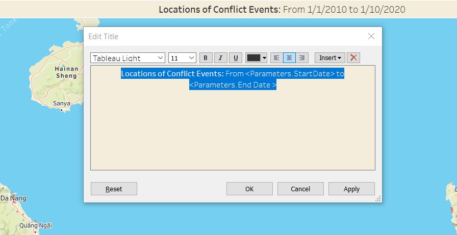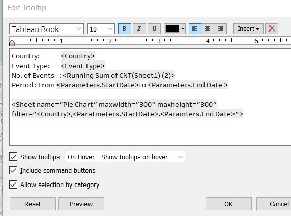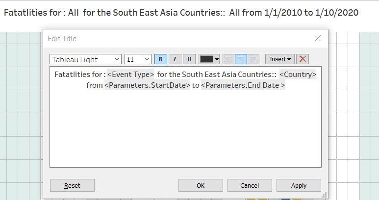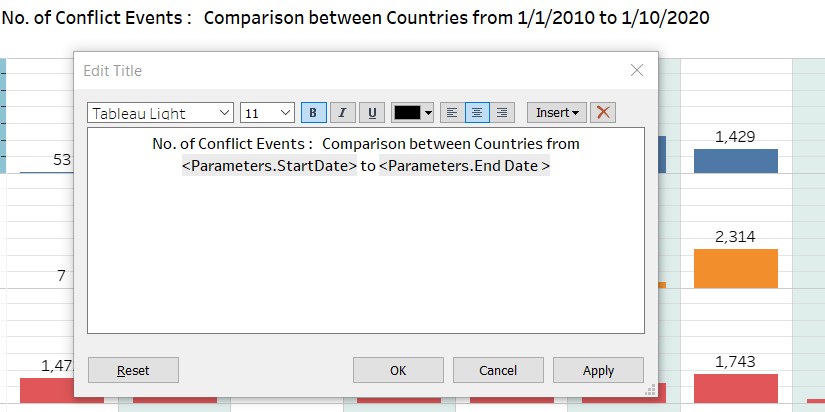 7.6.5 Customised the Title of the chart to dynamically reflect the Event type, and also the Countries and StartDate/EndDate from the filters.