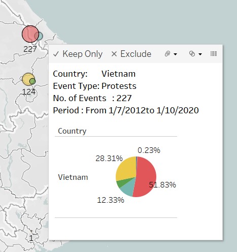 Based on the table ‘No of Conflict events – comparisons between countries’ – Philippines has the most no. of “Violence against civilians” across the complete data collection period. Mynammar has the most no. of Battles, and Indonesia has the most no. of protests, across the data collection period from 2010 to 2020.