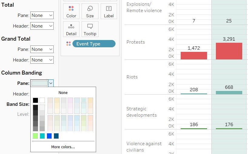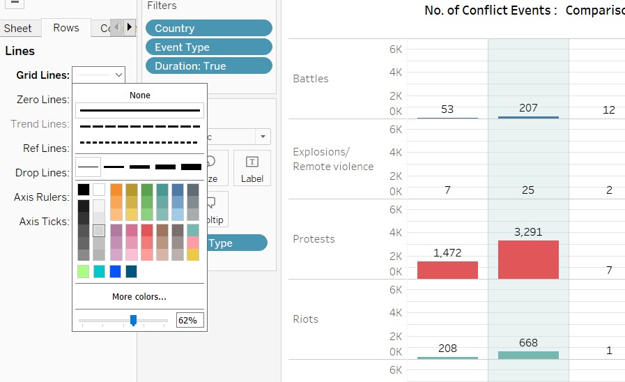 7.4.3 Format the Chart. Configure Grid lines – from the top bar, select ‘Format’, ‘Gridlines’, Subtab Rows-select mid grey.Repate for Sub-tab Column.