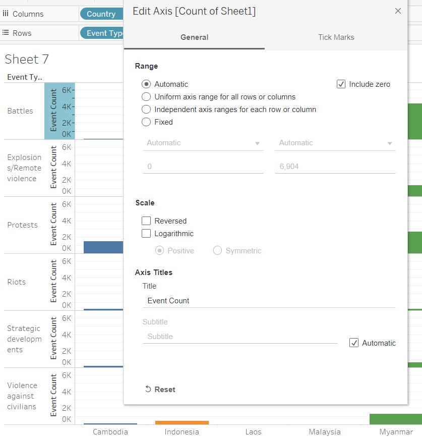 7.3.3 For Count – ensure that use count at both Country and Event Type level. Configure : Count(Sheet1) as follows: