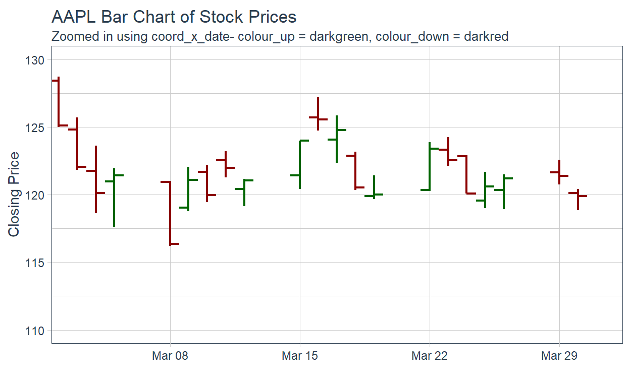 subtitle = "Zoomed in using coord_x_date- colour_up = darkgreen, colour_down = darkred",