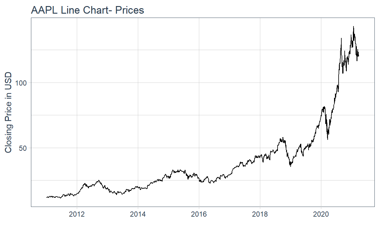 labs(title = "AAPL Line Chart- Prices", y = "Closing Price in USD", x = "") +