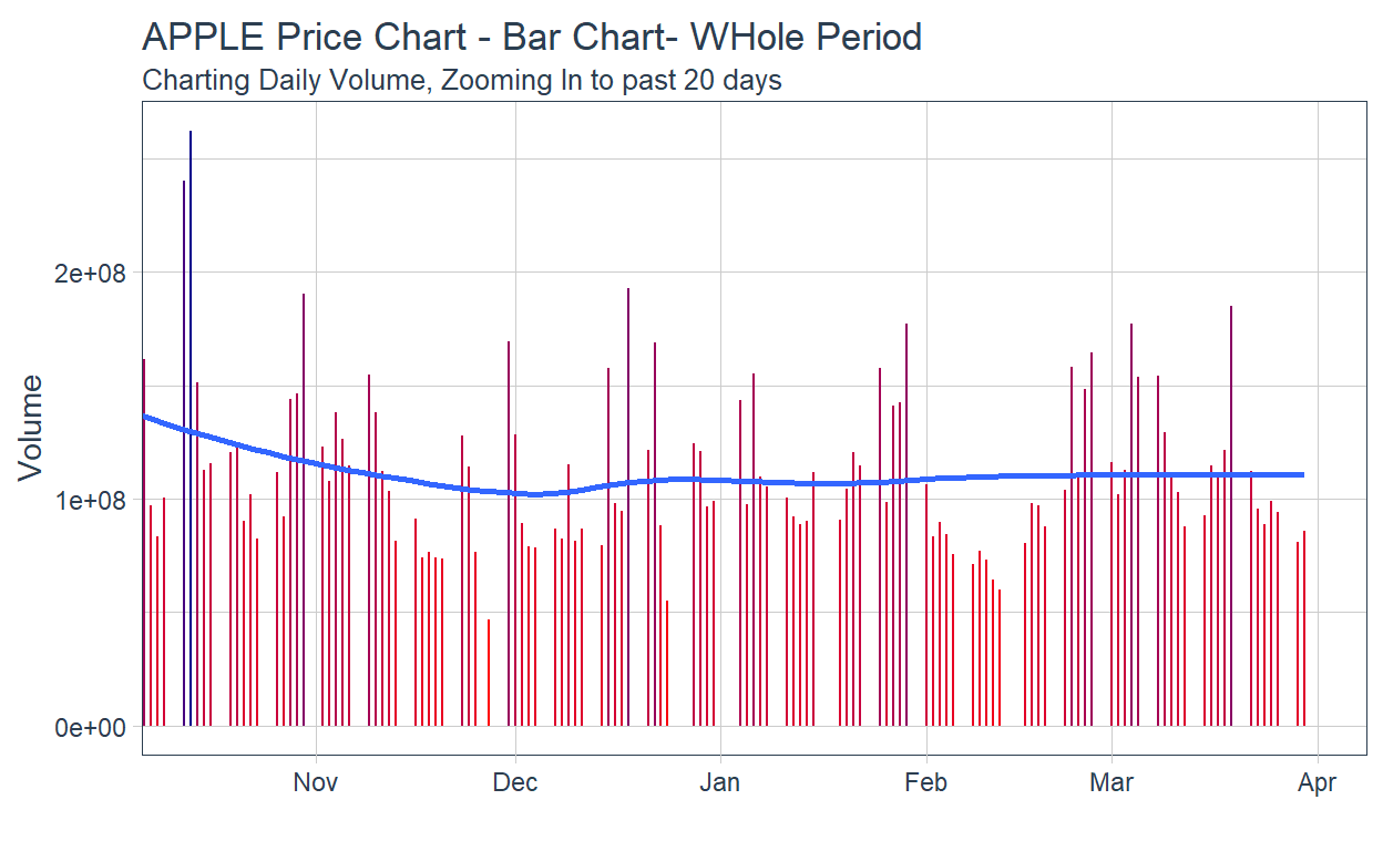labs(title = "APPLE Volume Chart - Bar Chart - Whole Period",