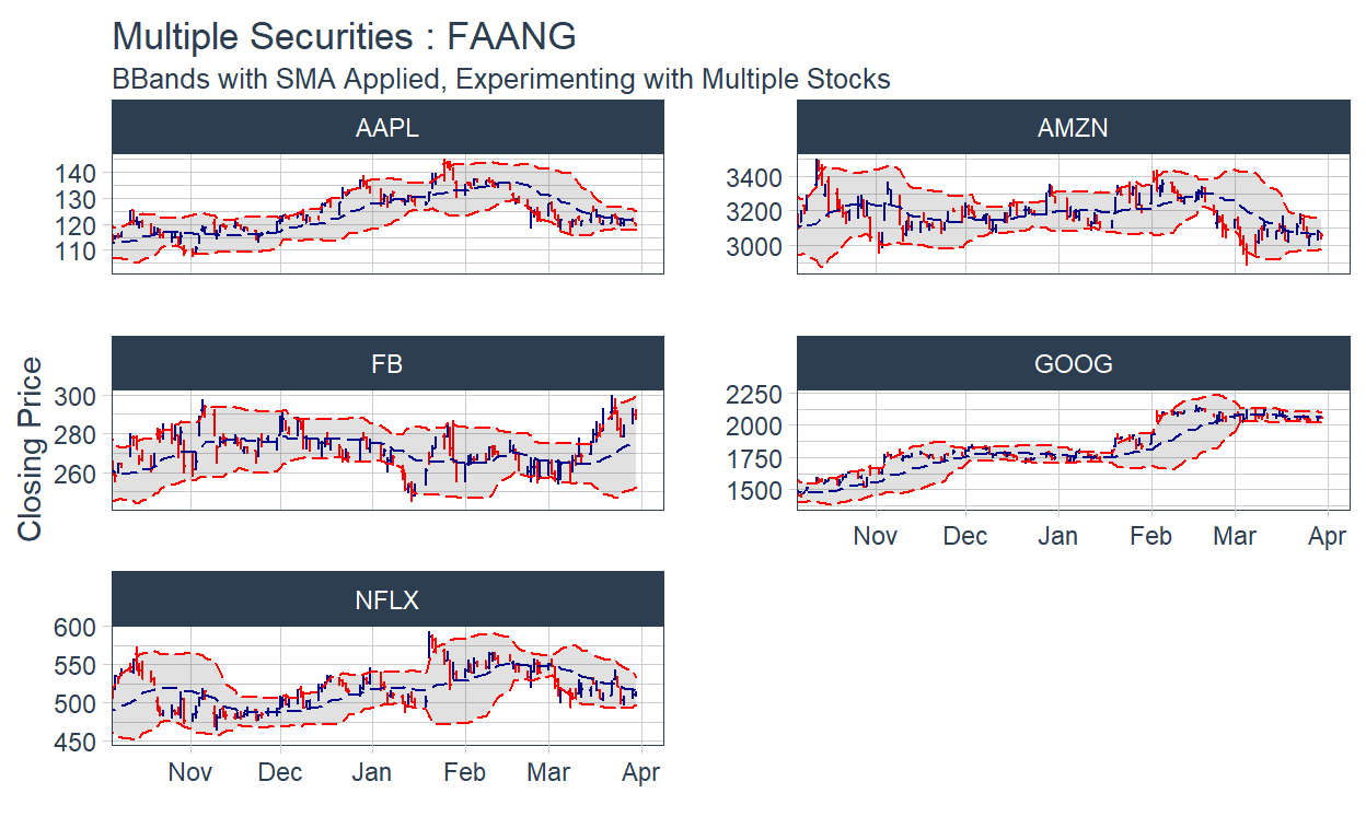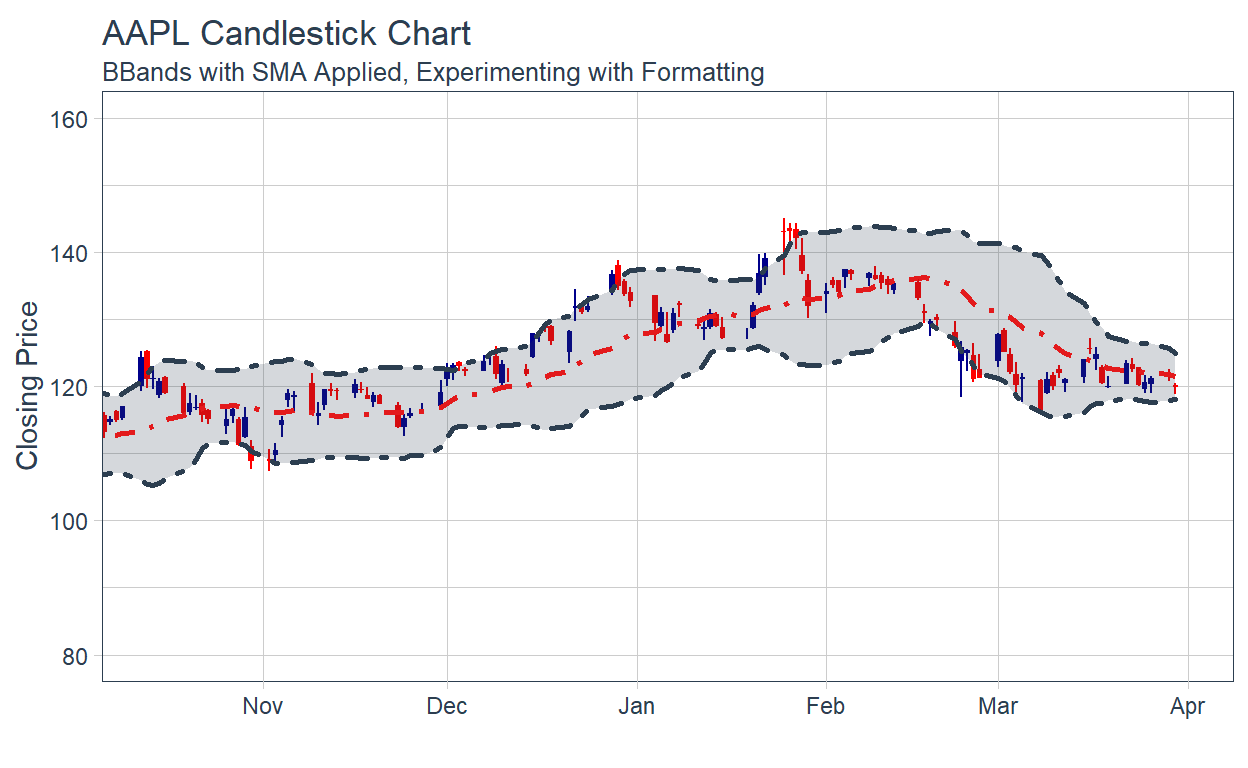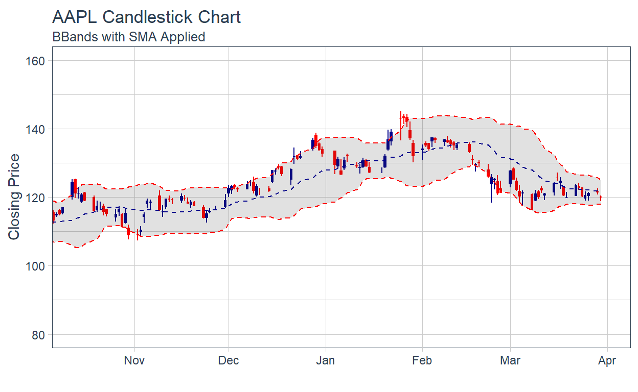 Bollinger Bands: Bollinger bands can be visualized using geom_bbands. The BBand moving average can be one of the seven available in Moving Averages.