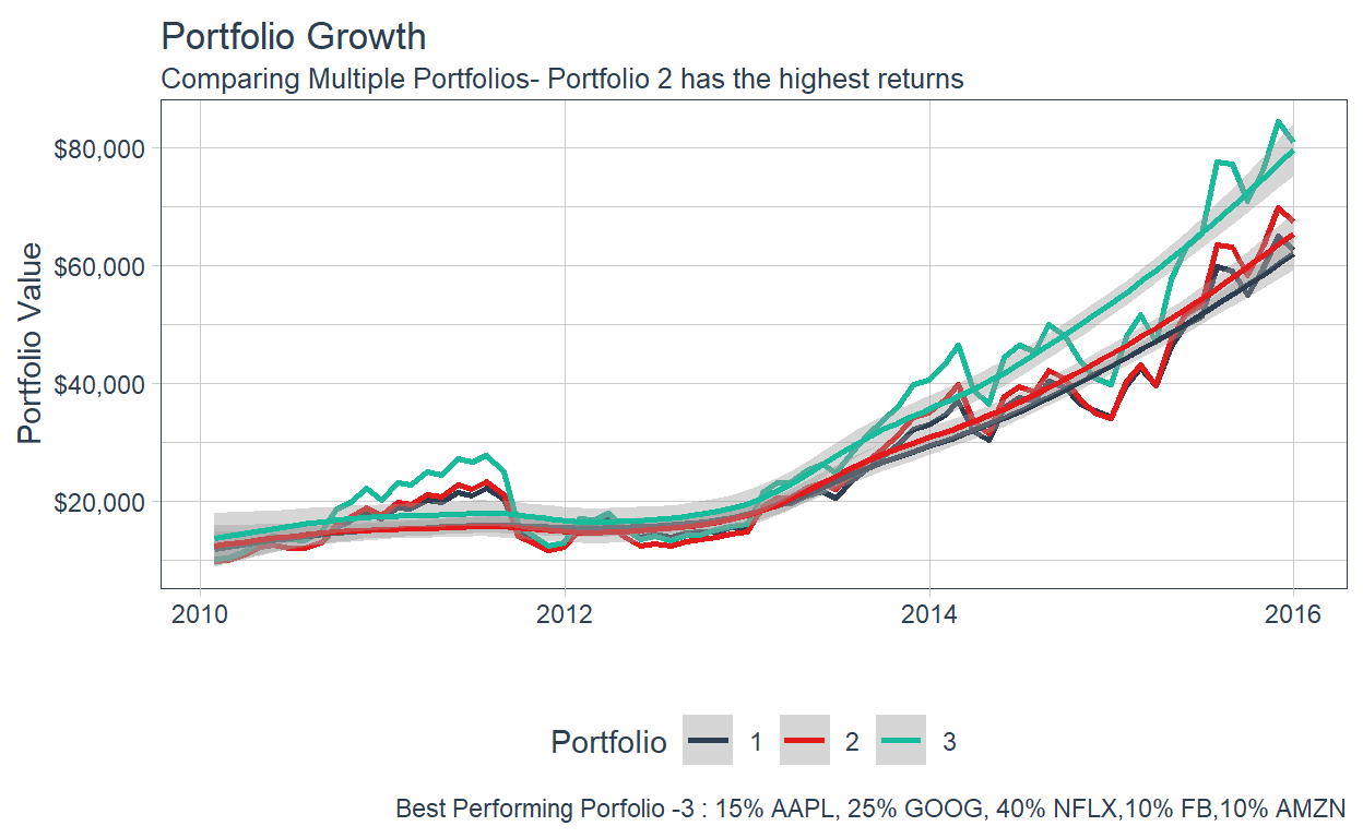 subtitle = "Comparing Multiple Portfolios- Portfolio 2 has the highest returns",